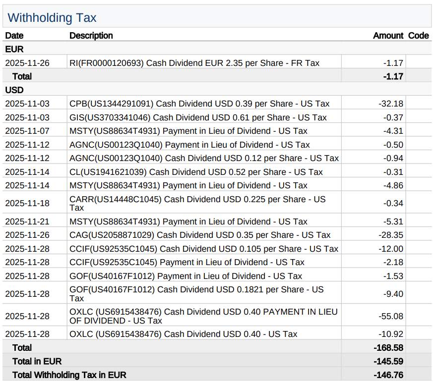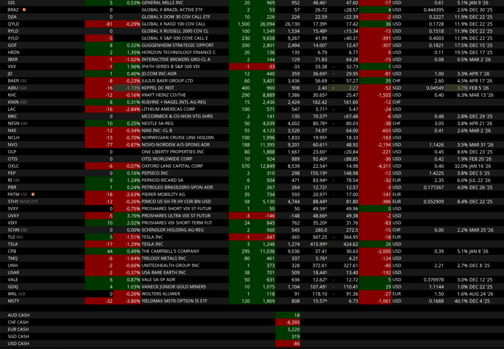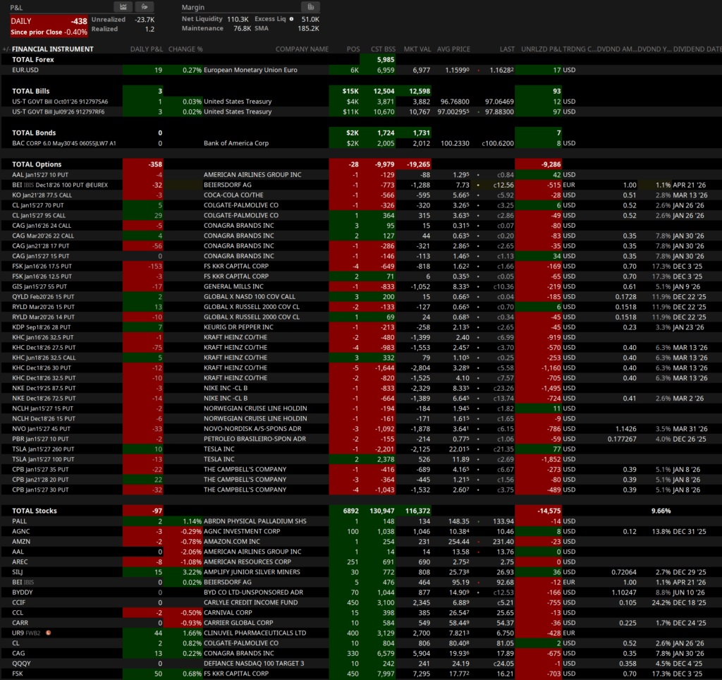 NKE wird mir aller Voraussicht nach im Dezember eingebucht werden. In dem Fall werde ich dann die Position langsam im Verlust verringern. Außerdem werde ich weiterhin Positionen abbauen, sobald ich in der jeweiligen Gewinnzone bin, um beim nächsten Wellengang mit ausreichender Margin wieder mitsurfen zu können.