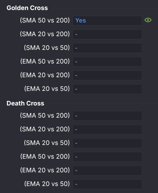 Da ich in der Vergangeheit einen ähnlich Stil gefahren habe, will ich näher an seine Strategie rücken. Hier hilft mir, dass ich bei Gurufocus direkt nach „Golden Cross“ [Long] und „Death Cross“ [Short] filtern kann:
